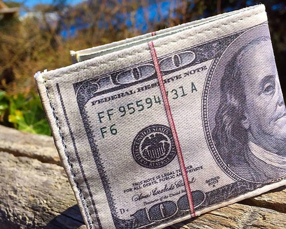 BILLETERA DE CUERO Y GABARDINA ESTAMPADA DISEÑO DOLAR